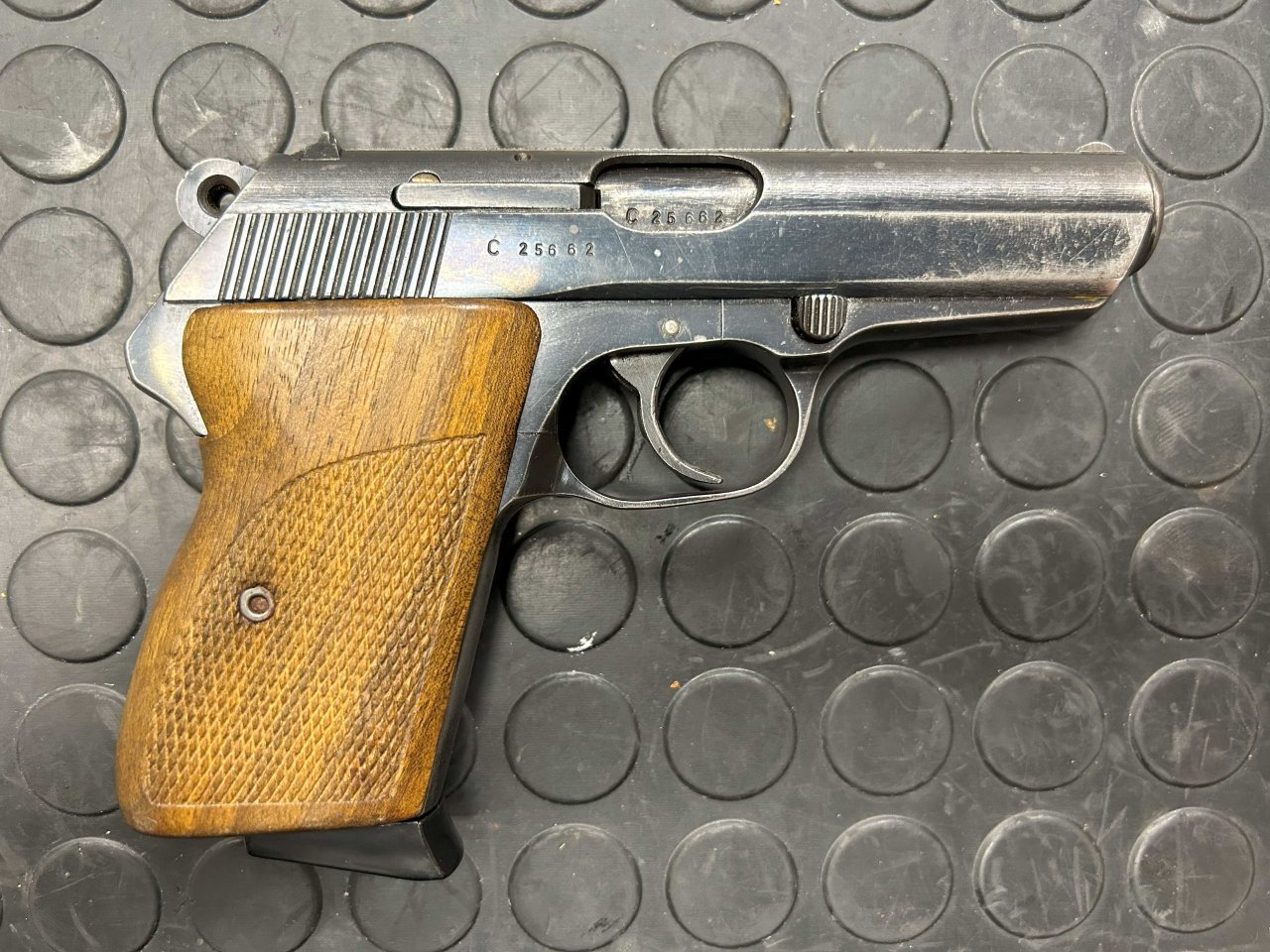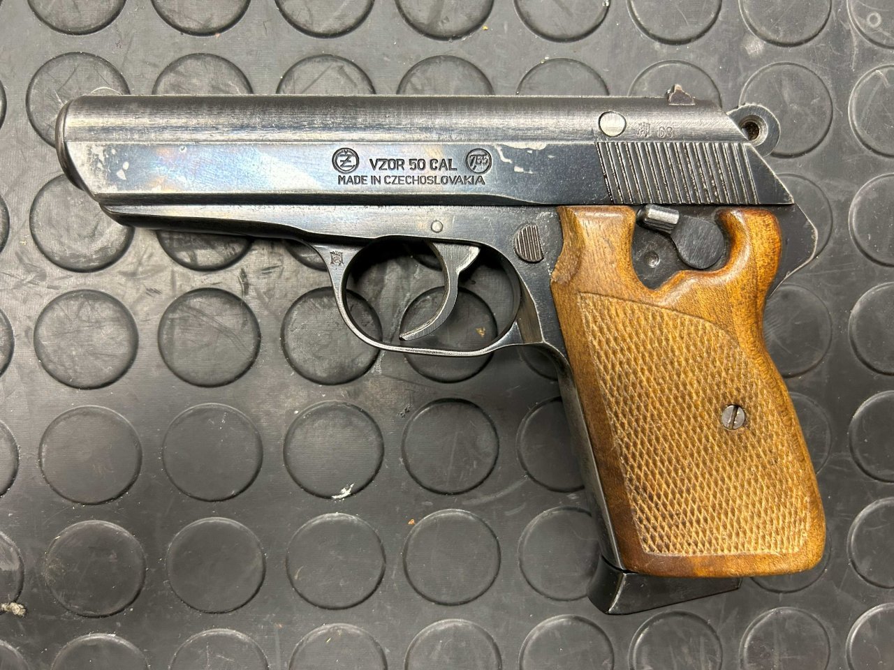 | Samonabíjecí pistole CZ50 v ráži 7,65mm. Zbraň má zkušební značku z roku 1968. Ke zbrani jsou celkem dva zásobníky. | |