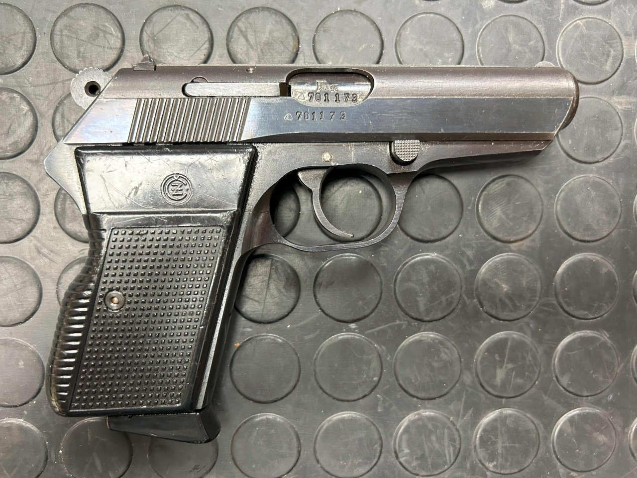 | Samonabíjecí pistole CZ70 v ráži 7,65mm. Zbraň má zkušební značku z roku 1981. Ke zbrani jsou celkem dva zásobníky. | |
