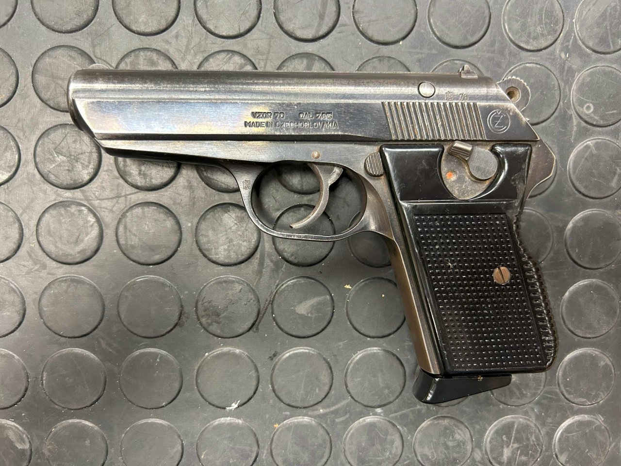 | Samonabíjecí pistole CZ70 v ráži 7,65mm. Zbraň má zkušební značku z roku 1976. Ke zbrani jsou celkem dva zásobníky. | |