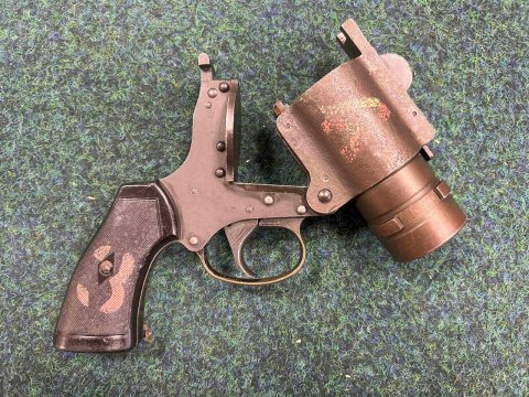 | Signální pistole RAF výrobce 'Webley & Scott' model No.4 MkI značena britskou zkušebnou 'BNP' (Birmingham Nitro Proof). | |
